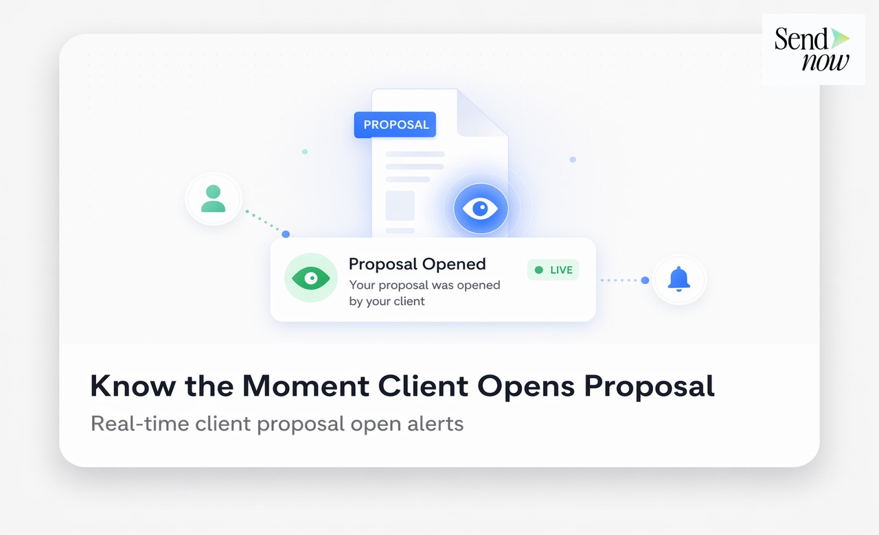 Get instant notifications when your proposals are opened. SendNow delivers real-time alerts via email, Slack, or push notification the moment a client accesses your document. Start at sendnow.live.