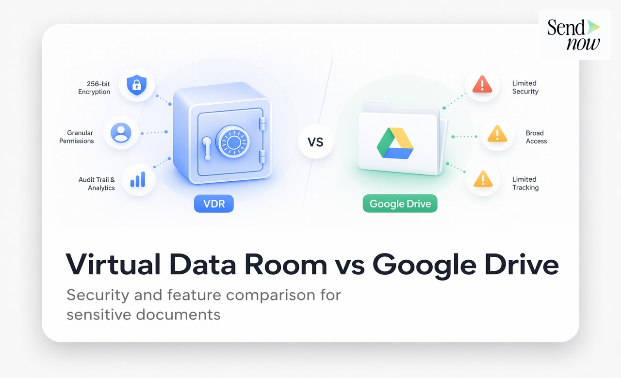 La conséquence pratique : lorsque vous partagez un document de transaction via Google Drive, vous créez un lien partageable avec un accès large. Lorsque vous partagez le même document via la salle de données virtuelle de SendNow, vous créez un événement d'accès contrôlé, audité et pouvant être soumis à une porte.