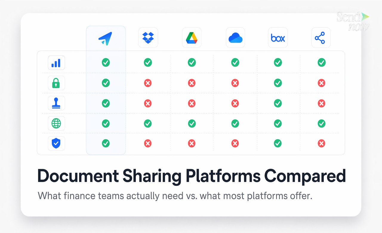 | Feature | Cloud Storage | Proposal Tools | Enterprise VDR | Purpose-Built (SendNow) |